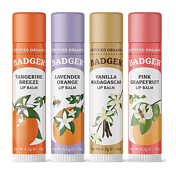 A Little Magic for your Lips! USDA Certified Organic natural lip balms from Badger Balm in four flavours: Pink Grapefruit, Vanilla Madagascar, Lavender & Orange, and Tangerine Breeze.Â