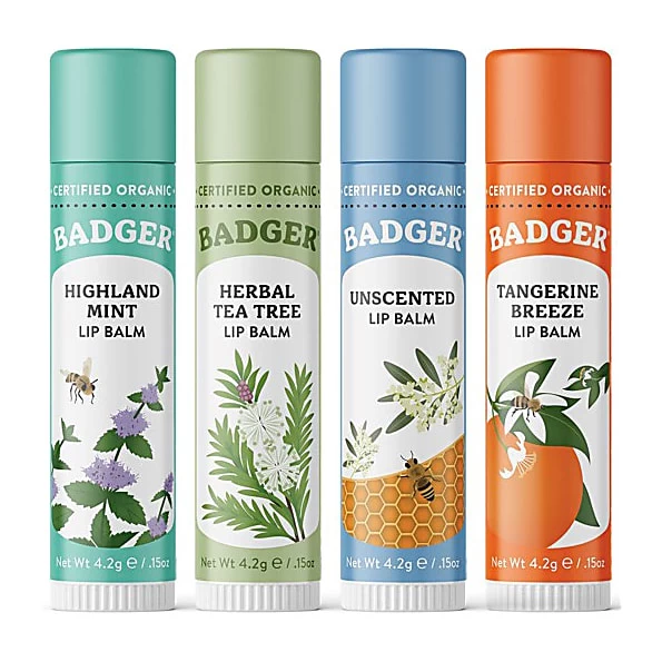 Try it. Use it. Never lose it! One Classic Lip Balm stick makes a great gift, so four must be extraordinary! USDA Certified Organic natural lip balms from Badger Balm in four flavours: Tangerine Breeze, Herbal Tea Tree, Highland Mint and Unscented.