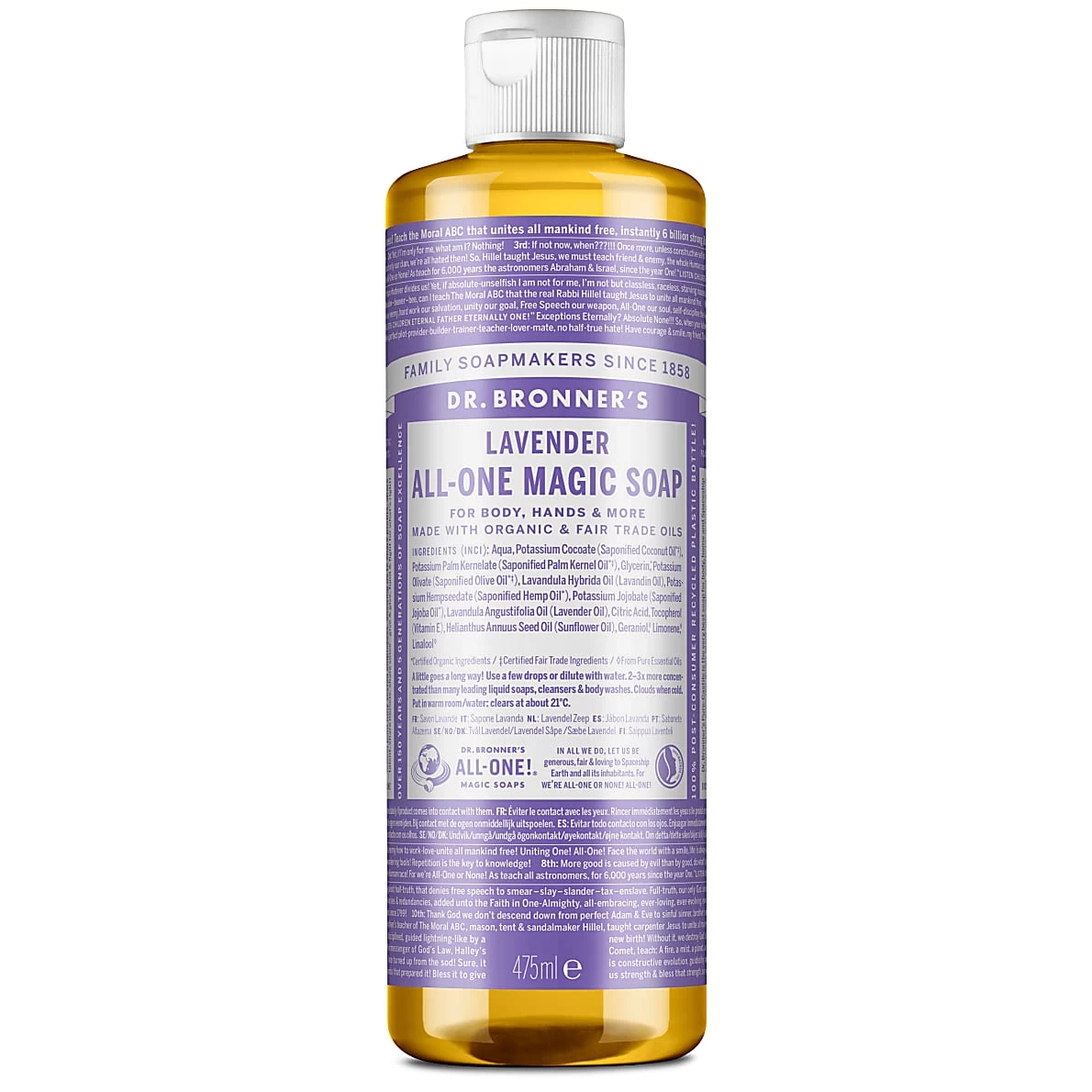 Dr. Bronner’s Lavender Castile Liquid Soap – 475ml is part of the range of organic . These eco-friendly soaps are gentle enough to use on your face, hair and body, with products to suit the whole family, whether you’re looking for  or a something that’s . Liquid castile soaps are multitaskers, and are tough enough for use as a household detergent too! Explore the full range of , including  and , available from Big Green Smile.