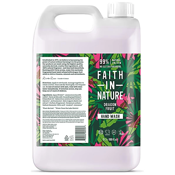 Faith in Nature Dragon Fruit Hand Wash 5 Litre is a great value bulk buy handwash refill option that offers a more sustainable way of reducing plastic waste. This exotically fragranced handwash harnesses the benefits of vitamin, mineral and antioxidant-rich dragon fruit to nourish dry hands while effectively and gently removing dirt and bacteria. Faith in Nature natural hand wash is vegan and cruelty-free, perfect for anyone wanting to be as kind to the planet as they are to their skin.