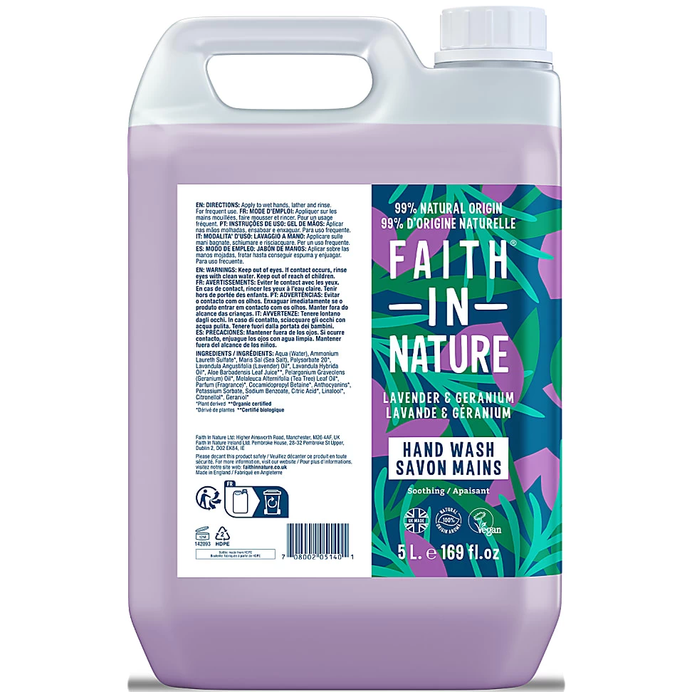 Faith in Nature Lavender and Geranium Hand Wash 5l refills are a bulk buy handwash refill option that provides great value and offers a more sustainable way of reducing plastic waste. Lavender and geranium always bring a sense of calm to every day, and this magnificently fragrant hand wash will do just that. Breathe deep, and relax. This 5l bulk buy option has 100% recyclable packaging, is vegan and cruelty-free, and is made with natural ingredients, making this a great eco hand wash refill option. Perfect for anyone wanting to be as kind to the planet as they are to their skin.