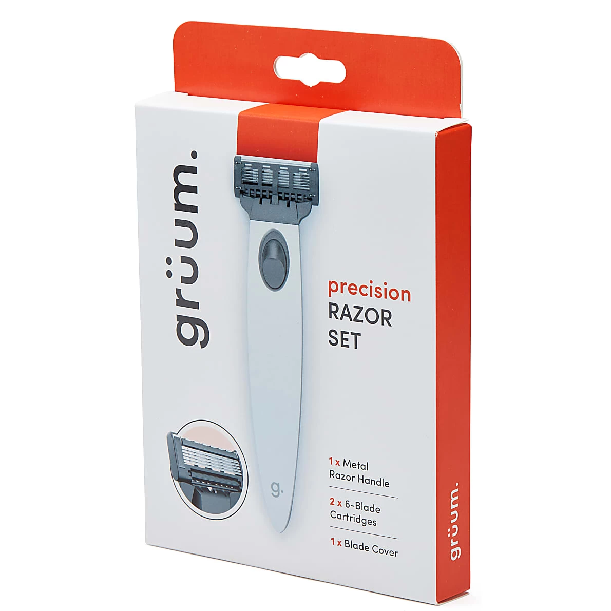 The Precision Razor Set contains a bright and bold premium razor handle, two of grüum’s signature precision cartridges (featuring five ultra thin blades plus trimmer) and a blade cover to keep your new razor in tip top condition.