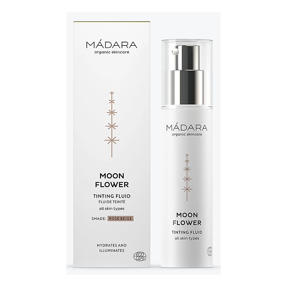 Madara Moon Flower Rose Beige Tinted Fluid tints, illuminates and evens out your skin tone. Northern Rose Hip extract and natural pigments instantly hydrate and perfect the skin’s appearance. Masks imperfections and fine lines, leaving skin fresh and radiant. A lighter alternative to foundation.
