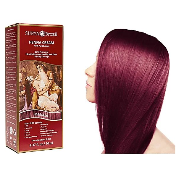 Surya Brasil Henna Cream in marsala is a semi-permanent organic hair colour cream that contains powerful henna from India and various herbal and fruit extracts from Brazil. Enjoy complete grey coverage without the need for harmful chemicals, plus healthy shiny hair and a brilliant hair colour! What’s more, Surya Henna Cream colours are mixable, so you can create your own perfect shade easily at home.